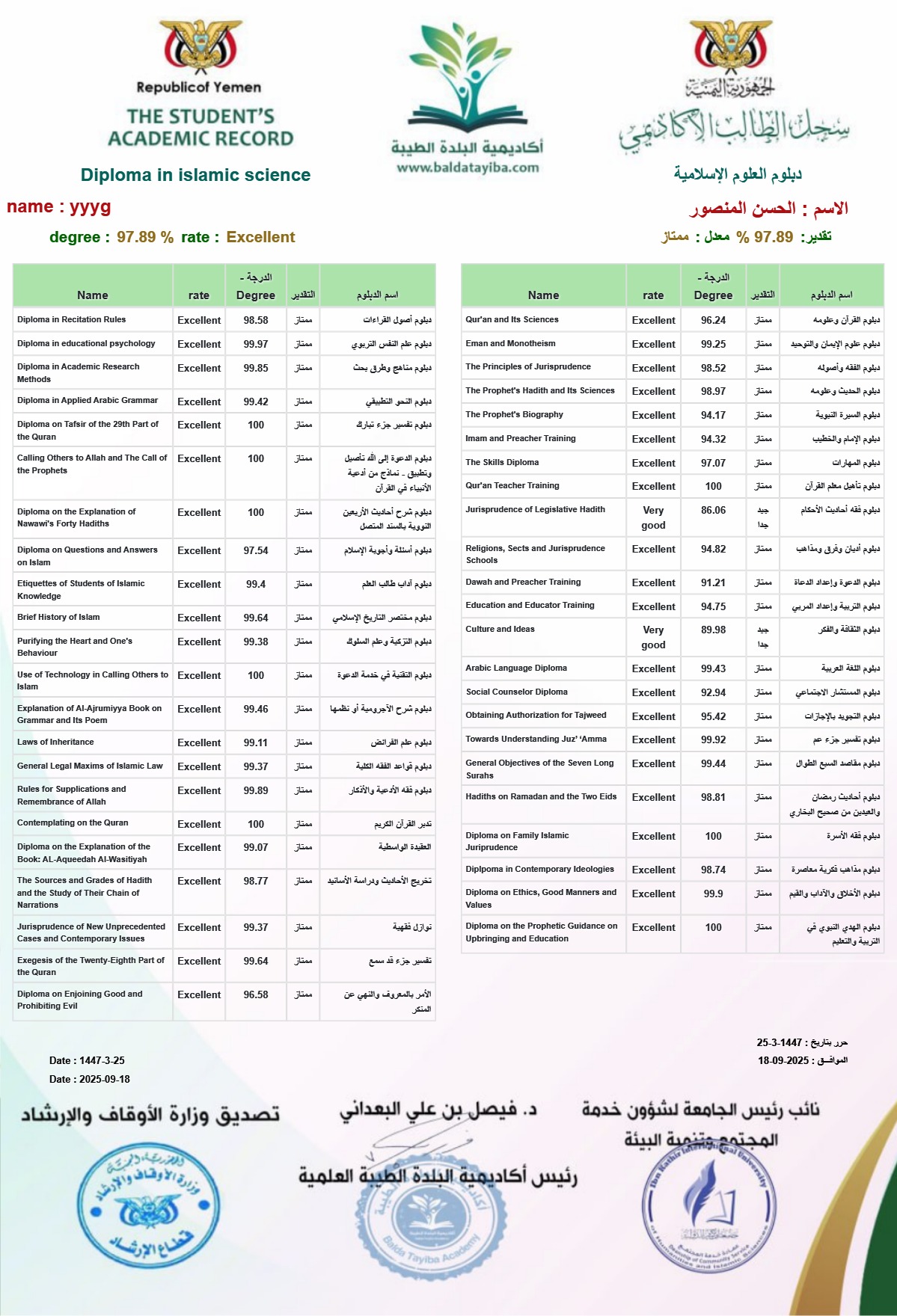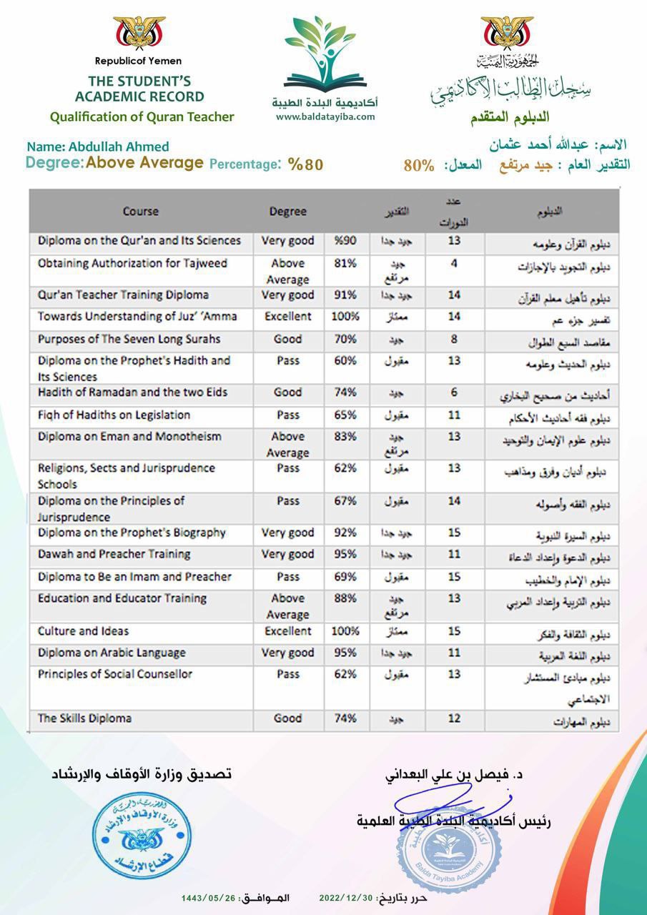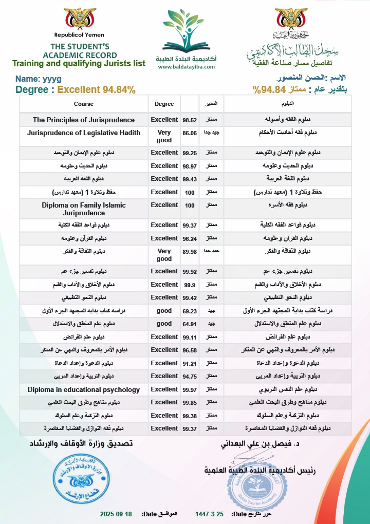 شهادة سجل دبلوم العلوم الإسلامية