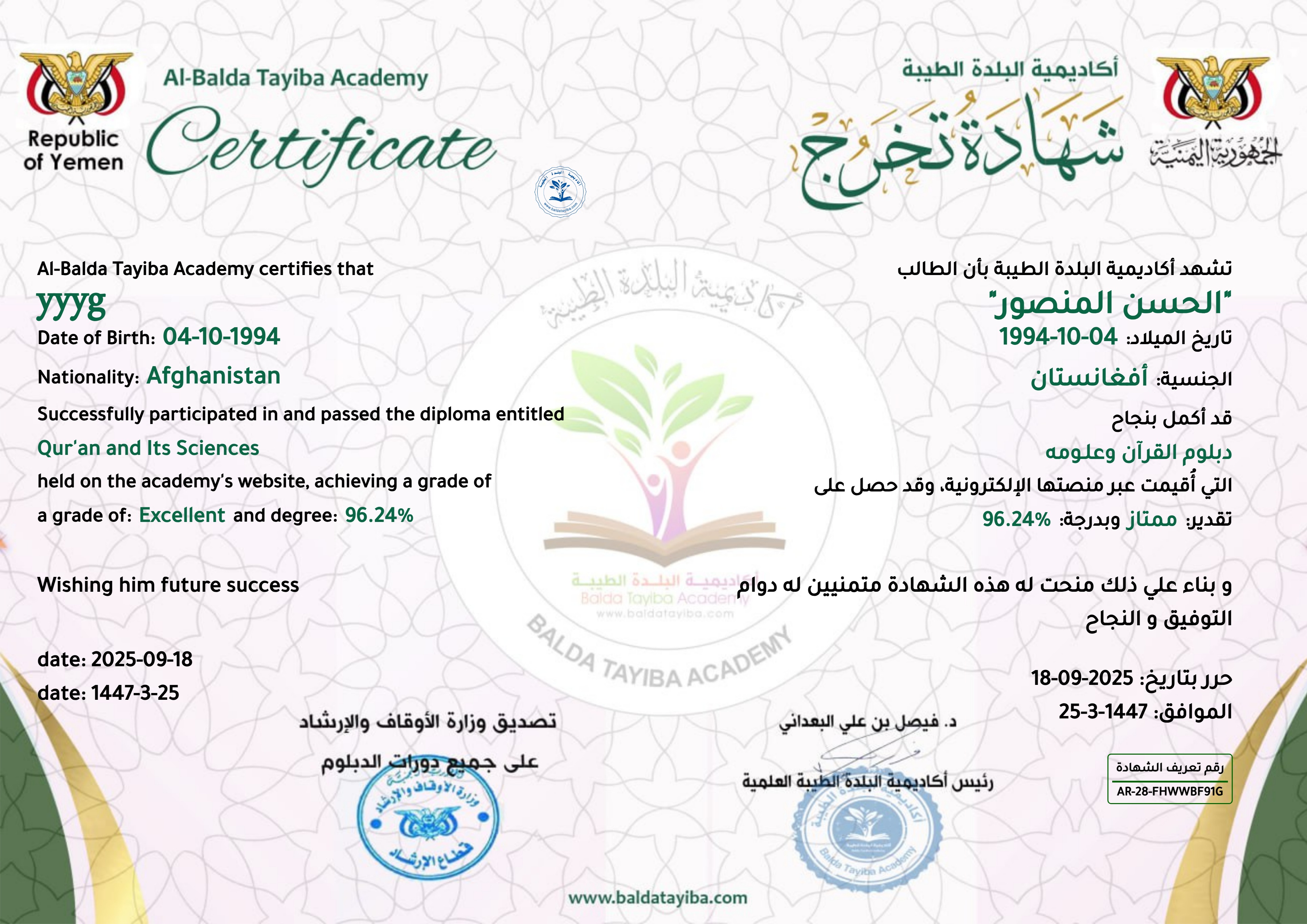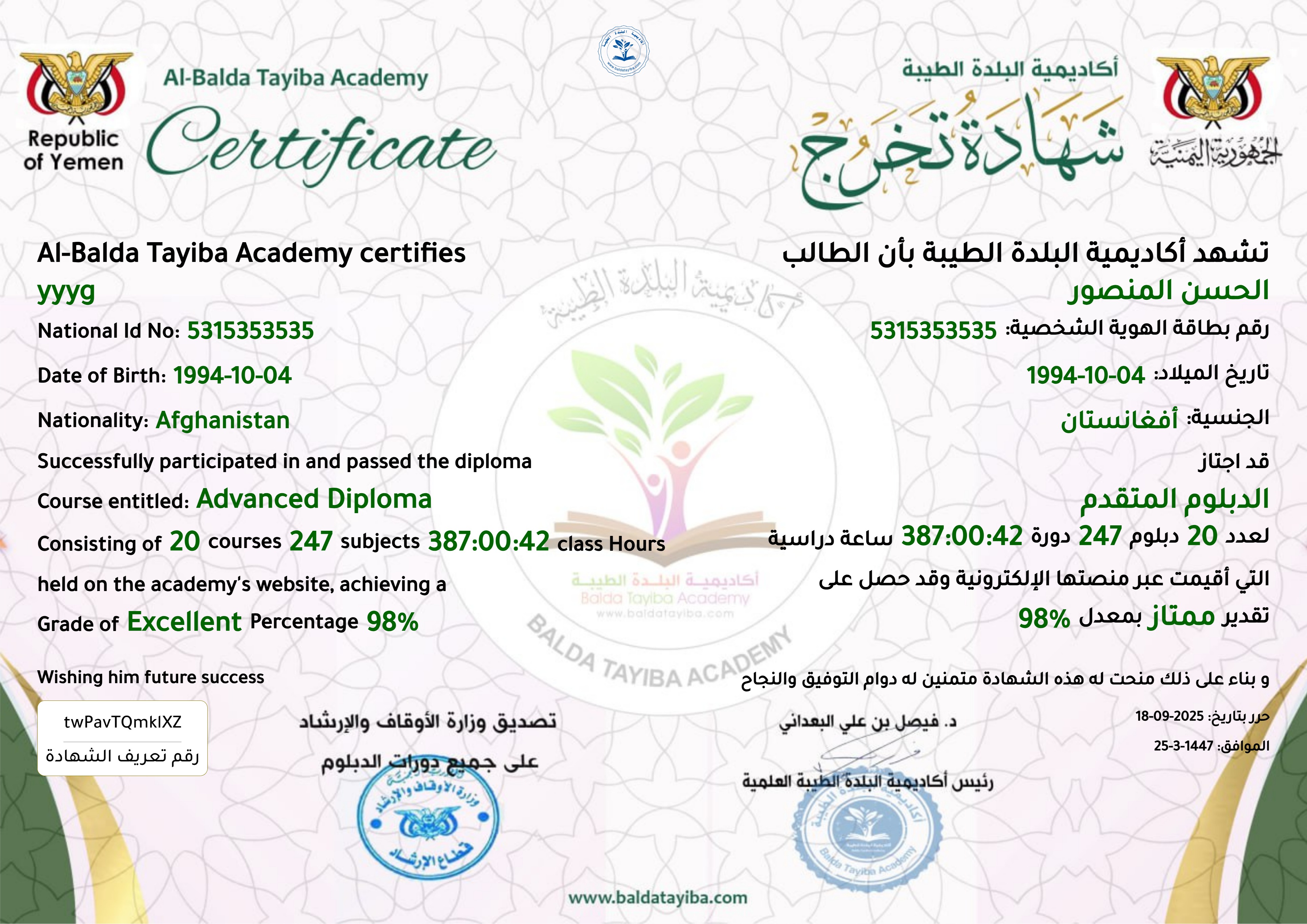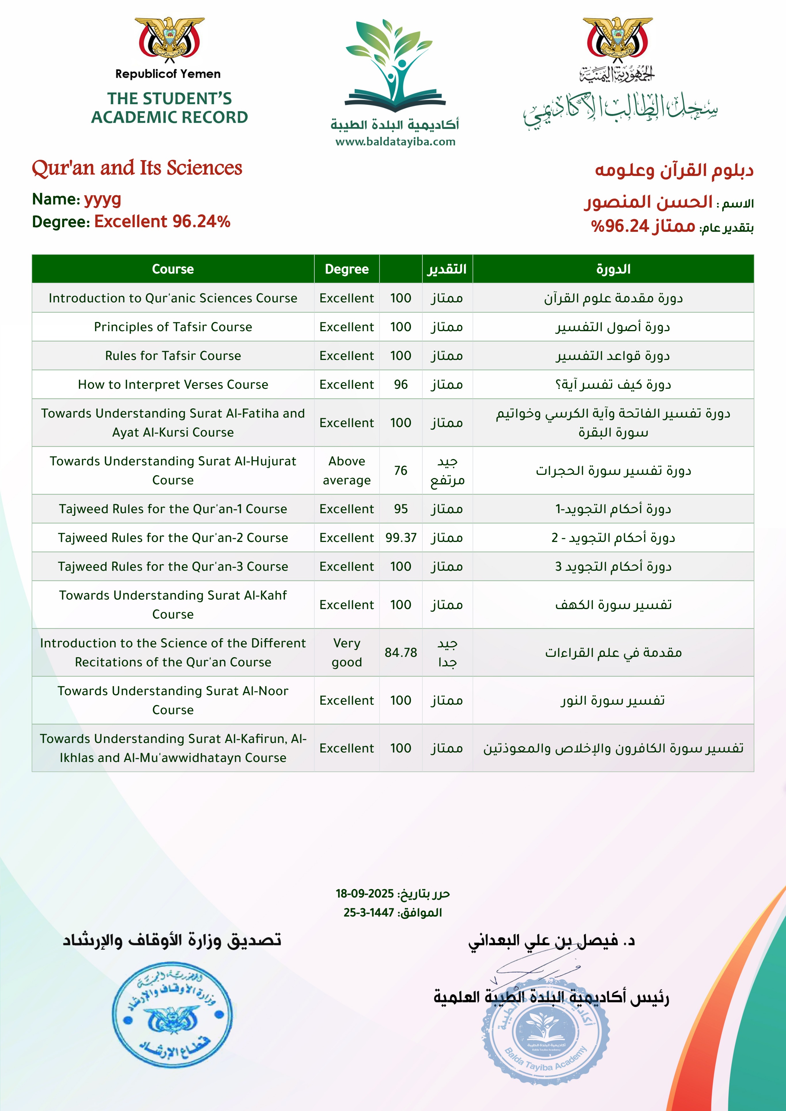 شهادة سجل دبلوم العلوم الإسلامية