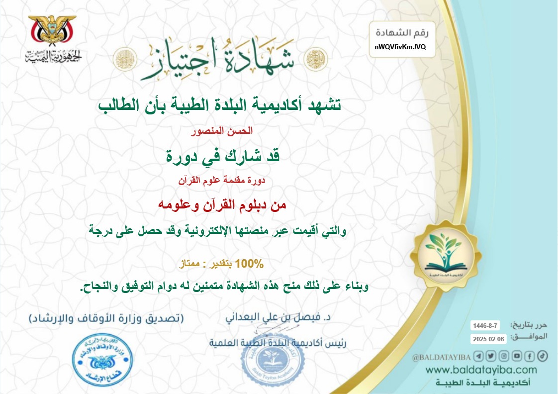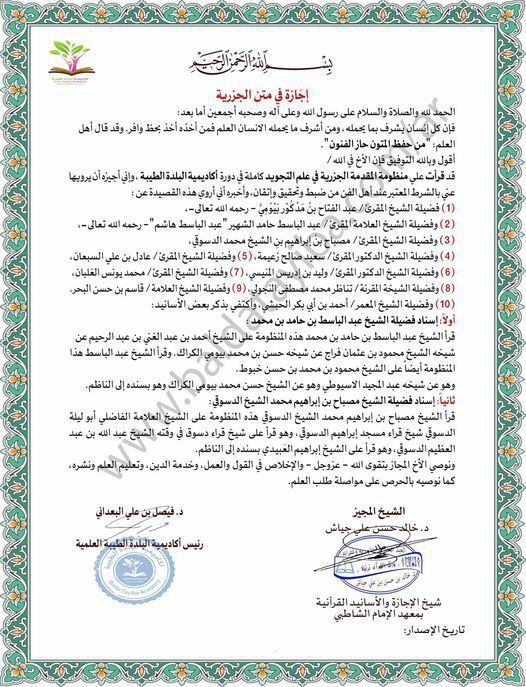 إجازة شرعية معتمدة تثبت إتقان الطالب لمتون التجويد المقررة، وذلك بالسند المتصل بعد قراءتها كاملة أو تسميعها غيبًا على الشيخ المجاز