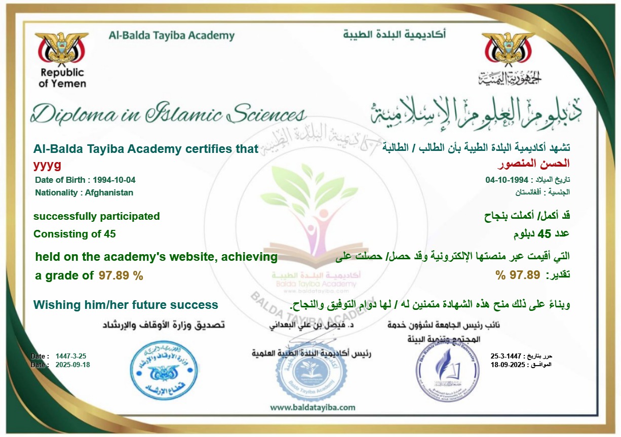 شهادة معتمدة تمنح للطالب بعد إتمام 45 دبلومًا في العلوم الإسلامية (باستثناء دبلوم ما لا يسع المسلم جهله).