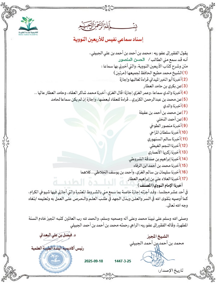 إجازة شرعية معتمدة تمنح لحضور دبلوم شرح أحاديث الأربعين النووية